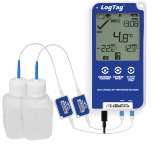 Both devices are available in single- and dual-channel formats, with probes supplied on 1.5 m or 3 m cables. Each kit includes a wall mounting bracket, calibrated SMART probes, glycol buffer adaptor, stand, glycol, and a licence for LogTag Online.
