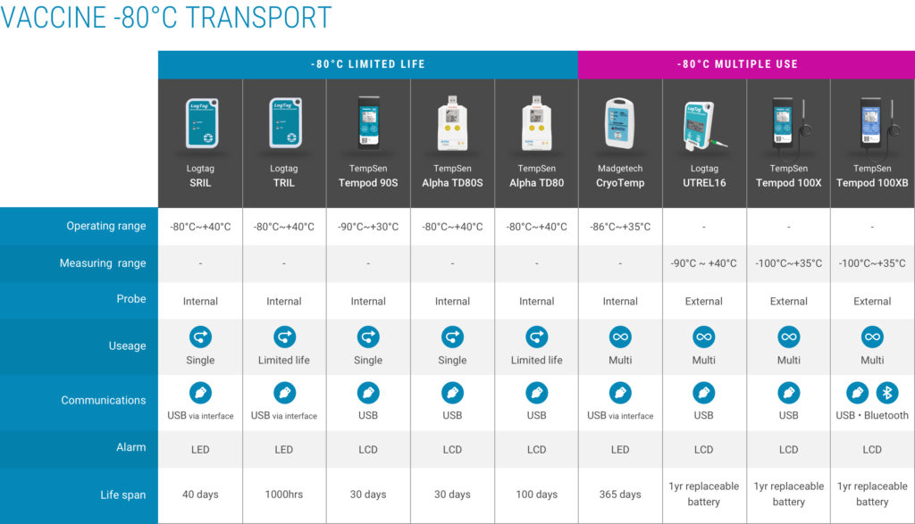 - -80°C Storage: If you are storing vaccines in ultra-low freezers before reaching vaccination centres, our -80°C temperature data loggers ensure vaccines remain in optimal conditions.