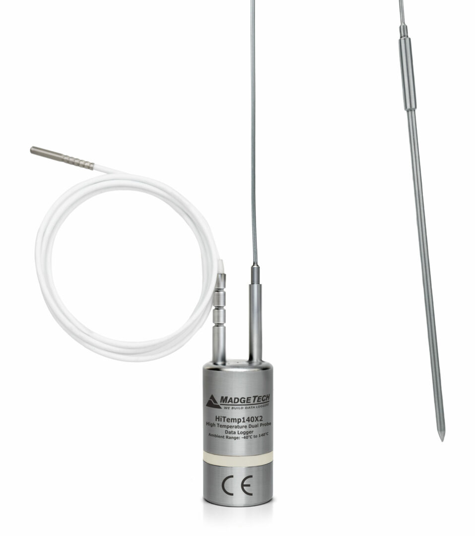 HiTemp140X2-72FP-PT5 | Channel 1: 72″ FP flexible probe | Channel 2: 24″ PT mineral insulated probe with 5″ tip