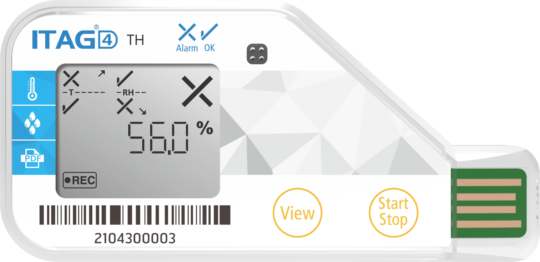 Tempsen iTag4rH is a single use temperature and humidity USB, PDF, recording indicator, delivering all the functionality of a calibrated data logger but with the addition of a clear and detailed LCD display instantly providing details on recorded data, alarm excursions and transport duration statistics.