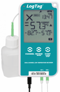 The UTREL16 is a -90°C min/max ultra low vaccine temperature data logger with connector for an external temperature sensor, LCD display and integrated USB connector.