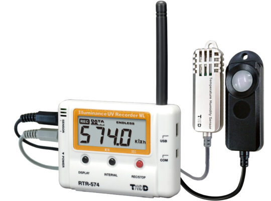 The RTR-574 can measure and record temperature data from 0 ~ 55°C, humidity values from 10 ~ 95%, illuminance from 0 lx ~ 130 klx and UV intensity from 0 ~ 30 mW/cm2 and will interface with any RTR-500 base station.