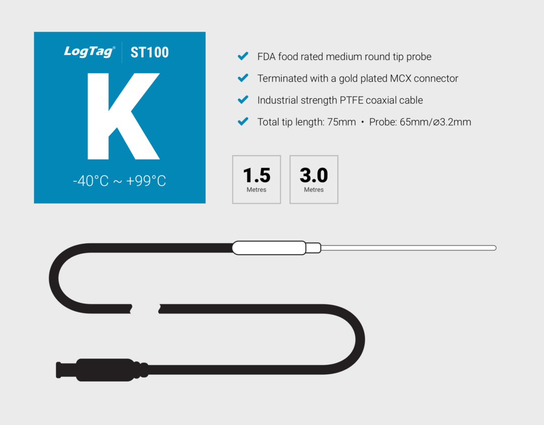 The LogTag® ST100 probe range is distinguished from other remote temperature probe types by the blue sleeve blue body at the plug end of the probe cable. All materials at probe end of the cable are FDA food rated, including the cable and terminated with a high quality gold plated MCX connector & industrial strength PTFE coaxial cable.