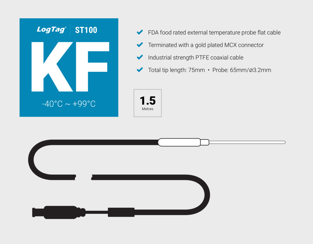 The LogTag® ST100 probe range is distinguished from other remote temperature probe types by the blue sleeve blue body at the plug end of the probe cable. All materials at probe end of the cable are FDA food rated, including the cable and terminated with a high quality gold plated MCX connector & industrial strength PTFE coaxial cable.
