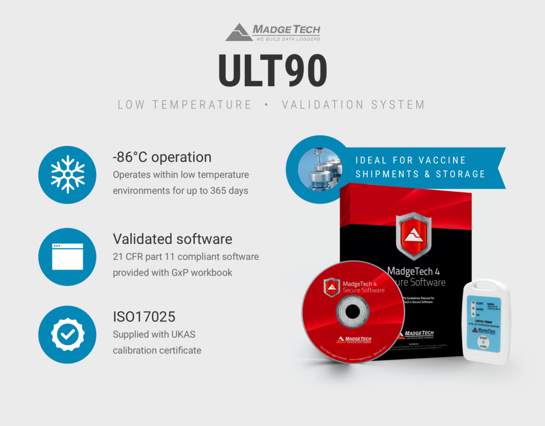 The ULT90 Ultra low temperature probeless data logging system is supplied with all that is required to validate appliances and processes operating at -86°C ~ +30°C in compliance with pharmaceutical regulated standards.